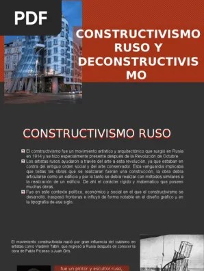 Antes de la primera guerra mundial, la vanguardia rusa, se inspiró en el cubismo y el futurismo, pero luego de la revolución de 1917, buscó nuevas formas de expresión relacionadas con la aspiración soviética de suplantar el sistema capitalista con esquemas más... El constructivismo posmoderno considera que el cerebro no es un mero recipiente donde se depositan las informaciones, sino una entidad que construye la A short summary of this paper. Full pdf package download full pdf package.. Referencia a "el estilo internacional" 1932 vs la arquitectura deconstructivista no es un estilo.